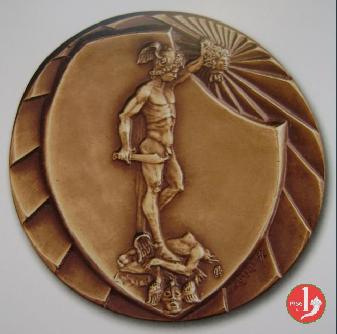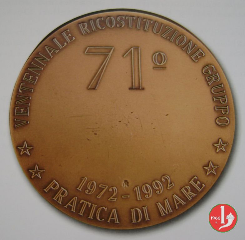 20° Anniversario della ricostituzione del 71° Gruppo Dritto: Raffigurazione della celebre scultura di del Perseo, opera di Benvenuto Cellini, collocata nella loggia dei Lanzi a Firenze, sovrapposta allo scudo di Minerva, costituisce l'araldica del 71° Gruppo; il fondo della medaglia è modellato a raggi, che si diffondono dalla testa mozzata della Medusa, mostrata dall'eroe quale vittoriso trofeo; a destra sotto lo scudo la firma dell'artista e la data 92. Verso: Nel giro la scritta ** VENTENNALE RICOSTITUZIONE GRUPPO ** = PRATICA DI MARE sopra le date 1972 - 1992; nel campo in alto il numero 71°; il campo della medaglia è lasciato liscio per l'eventuale incisione di dediche. | |