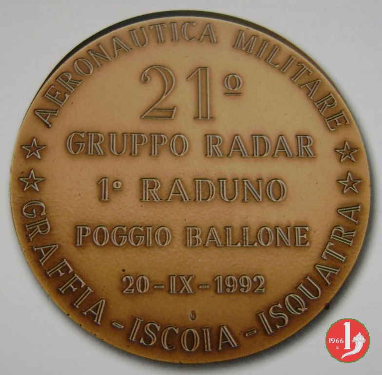 1° Raduno Nazionale del 21° Gruppo Radar Dritto: Raffigurata la mitica figura di Cerbero, mostruoso cane a tre teste e coda di drago, campeggia sovrapposta al quadrante di uno schermo radar, su fondo raggiato. Verso: Nel giro la scritta * * AERONAUTICA MILIATRE * * GRAFFIA - ISCOIA - ISQUATRA; nel campo su cinque righe la scritta 21° = GRUPPO RADAR = I° RADUNO = POGGIO BALLONE = 20-IX-1992. | |