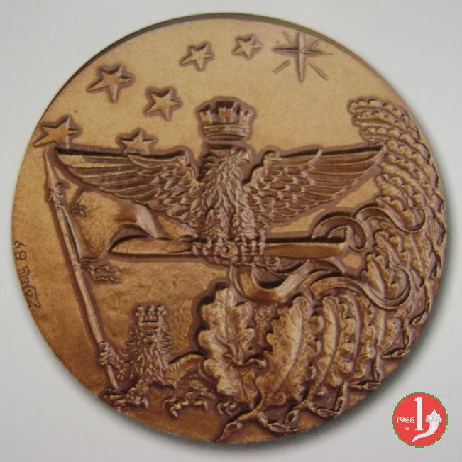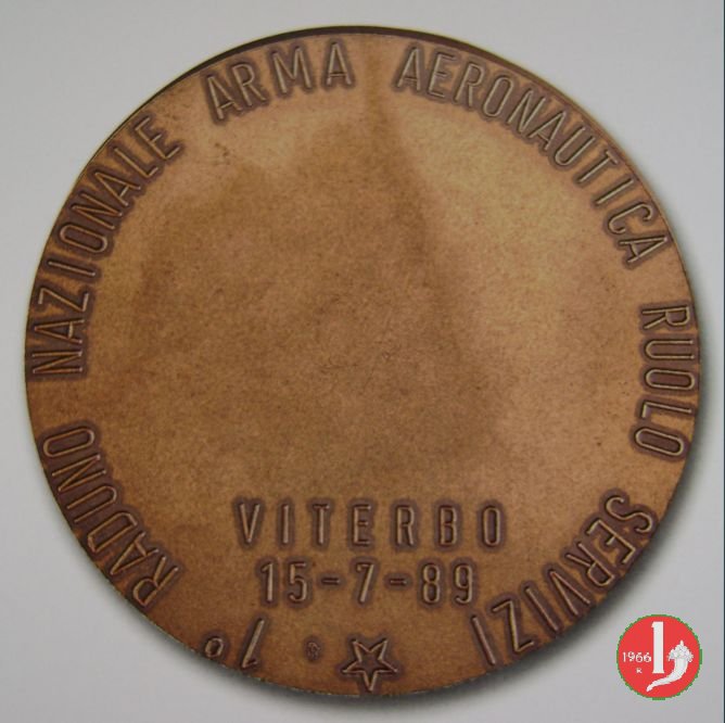 1° Raduno Nazionale dell'Arma Aeronautica Ruolo Servizi Dritto: Al centro della medaglia un'aquila turrita con le ali distese, appollaiata su un'elica, simbolo dell'A.M.; in basso a sinistra, un leone coronato con stendardo, araldica della città di Viterbo e a destra dodici coppie di foglie di quercia che simboleggiano le 12 specialità del ruolo Servizi; in alto la Costellazione del Carro e la Stella Polare, sul borso a sinistra la firma dell'artista e la data 89. Verso: Nel giro la scritta I° RADUNO NAZIONALE ARMA AERONAUTICA RUOLO SERVIZI * ; nel campo all'esergo su due righe VITERBO = 15 -7 -89; il campo della medaglia è lasciato libero per l'incisione di eventuali dediche. | |