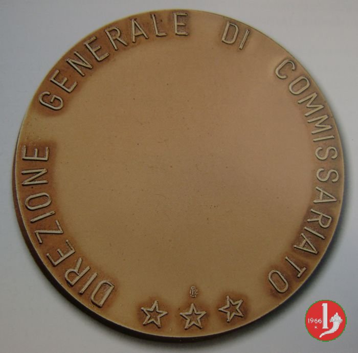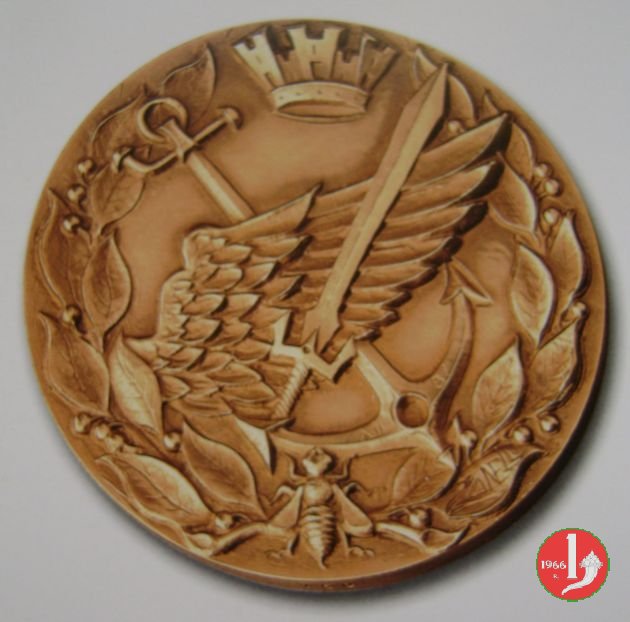 Medaglia della Direzione Generale di Commissariato Dritto: Raffigurazione dell'araldica della Direzione Generale di Commissaritao; i simboli delle tre Forze Armate, il gladio dell'Esercito, l'ancora della Marina e l'ala dell'Aeronautica entro una corona di fronde d'alloro; in alto una corona turrita, emblema dell'Italia ed in basso un'ape, simbolo di prosperosa operosità; in basso a destra, su una foglia, la firma dell'artista; sui bracci dell'ancora, la data XII 87. Verso: Nel giro la scritta DIREZIONE GENERALE DI COMMISSARIATO e tre stellette all'esergo; il campo della medaglia è liscio per l'incisione di eventuali dediche. | |