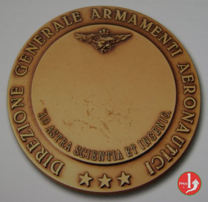 Medaglia della Direzione Generale Armamenti Aeronautici Dritto: Su un fondo a raggiera, un pentagono in smalto blu rievoca gli storici punzoni di collaudo sui quali erano incise le lettere G.A. (Genio Aeronautico) per contromarcare il materiale aeronautico, controllato dal personale del Genio; all'interno del pentagono, due elmi simboleggiano i distintivi di specialità del Corpo: l'elmo di Minerva Italica, decorato con la lupa di Roma, una fronda di alloro ed un'ala, rappresenta gli Ufficiali Ingegnieri; un elmo romano, gli Ufficiali Tecnici; sotto gli elmi i simboli delle quattro Forze Armate utenti dei sistemi acquisiti della D.G.A.A.; intorno, un girotondo di aquile stilizzate; a destra lungo il bordo la firma dell'artista e la data 2001. Verso: Nel giro la scritta DIREZIONE GENRALE ARMAMENTI AERONAUTICI e tre stellette; su disco centrale rialzato, l'aquila turrita da pilota militare e in esergo il motto AD ASTRA SCIENTIA ET INGENIO; il campo della medaglia è liscio per l'incisione di eventuali dediche. | |