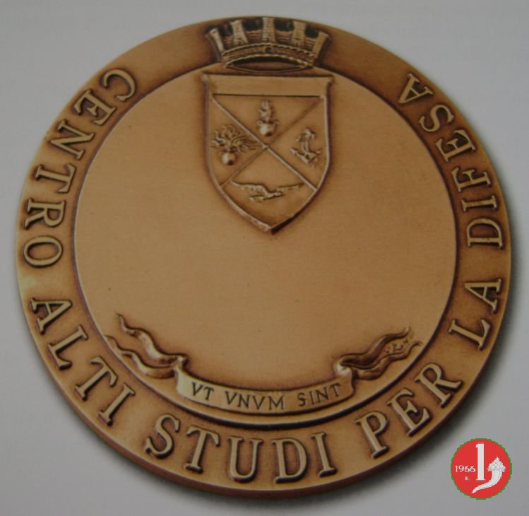 Medaglia del Centro Alti Studi per la Difesa Dritto: Raffigurata la facciata di Palazzo Salviati a Roma, attuale sede del Centro Alti Studi per la Difesa, sovrastata dallo stemma del Cardinale Salviati tra due stellette militari e da un cartiglio iscritto PALAZZO SALVIATI; alla base della facciata, a sinistra XVI SEC. epoca della costruzione del palazzo, che sorge sulle sponde del fiume Tevere, personificato dalla figura sdraiata con il braccio poggiato su una brocca, da cui sgorga acqua, resa con intarsi di smalto blu trasparente; a destra lungo il bordo la firma dell'artista e la data V II / MMII. Verso: Nel giro la scritta CENTRO ALTI STUDI PER LA DIFESA; su disco centrale rialzato, in alto, lo stemma del C.A.S.D.; all'esergo su cartiglio il motto VT VNVM SINT; al centro uno spazio vuoto per eventuali dediche; in basso a destra la firma dell'artista. | |