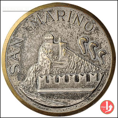 Centenario Prima Moneta di San Marino 1964 -ZB13 Dritto: CENTENARIO PRIMA _ MONETA SAMMARINESE riproduzioni semi-sovrapposte del fronte e del verso del 5 centesimi del 1864 in basso: VARISCO nel campo, a dx: TULIT = ALTER = HONORES = 1864 = 1964 alla base: LORIOLI | |