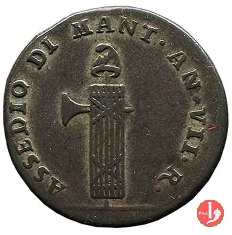 5 soldi Dritto: Fascio repubblicano in palo, munito di scure sulla sinistra e sormontato da berretto frigio. Intorno ASSEDIO DI MANT • AN • VII • R •. Verso: Nel campo: SOLDI DI MILANO V su quattro righe entro corona di alloro. | |