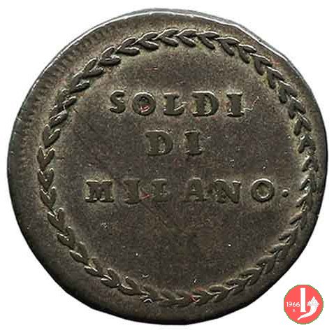 1 soldo Dritto: Fascio con scure sormontato da berretto frigio tra rami. Intorno ASSEDIO DI MANTOVA A • 7 R •. Verso: UN SOLDO DI MILAN' su quattro righe in un cerchio di perline. | |