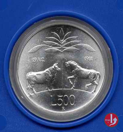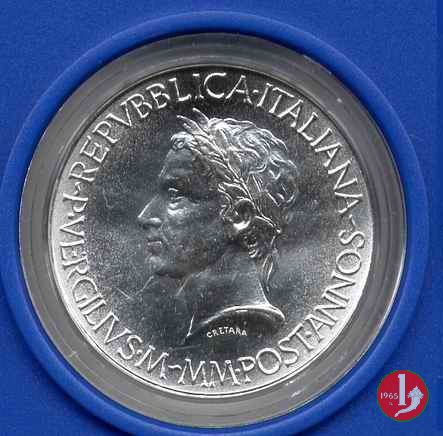 500 lire Virgilio Dritto: Profilo laureato a sinistra, di Publio Virginio Marone e leggenda circolare -REPVBBLICA • ITALIANA P • VERGILIVS. M MM. POST. ANNOS-. Sotto il busto, il nome dellautore CRETARA. Verso: Al centro, un albero, simbolo della fertilità • Ai lati di fronte, la figura di un bue che rappresenta il lavoro e di un cavallo, simbolo della poesia epica. Sulla sinistra del campo, 19 A • C •, anno di morte del poeta latino e sulla destra, il millesimo 1981. All'esergo, il valore della moneta L • 500 ed il segno della Zecca di Roma (R). | |