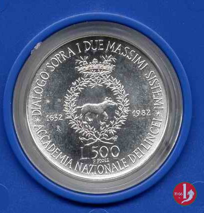 500 lire Galilei Dritto: Ritratto di Galileo Galilei, di fronte. Leggenda circolare, * REPUBBLICA ITALIANA * GALILEO GALILEI LINCEO Verso: Lo stemma dell'Accademia dei Lincei, al centro. A sinistra del campo, 1632, anno della pubblicazione del dialogo sopra i due massimi sistemi e il segno di Zecca (R). A destra, in giro, la scritta DIALOGO SOPRA I DUE MASSIMI SISTEMI * ACCADEMIA NAZIONALE DEI LINCEI. In basso, il valore L • 500 ed il nome dell'autore F • PIOLI | |