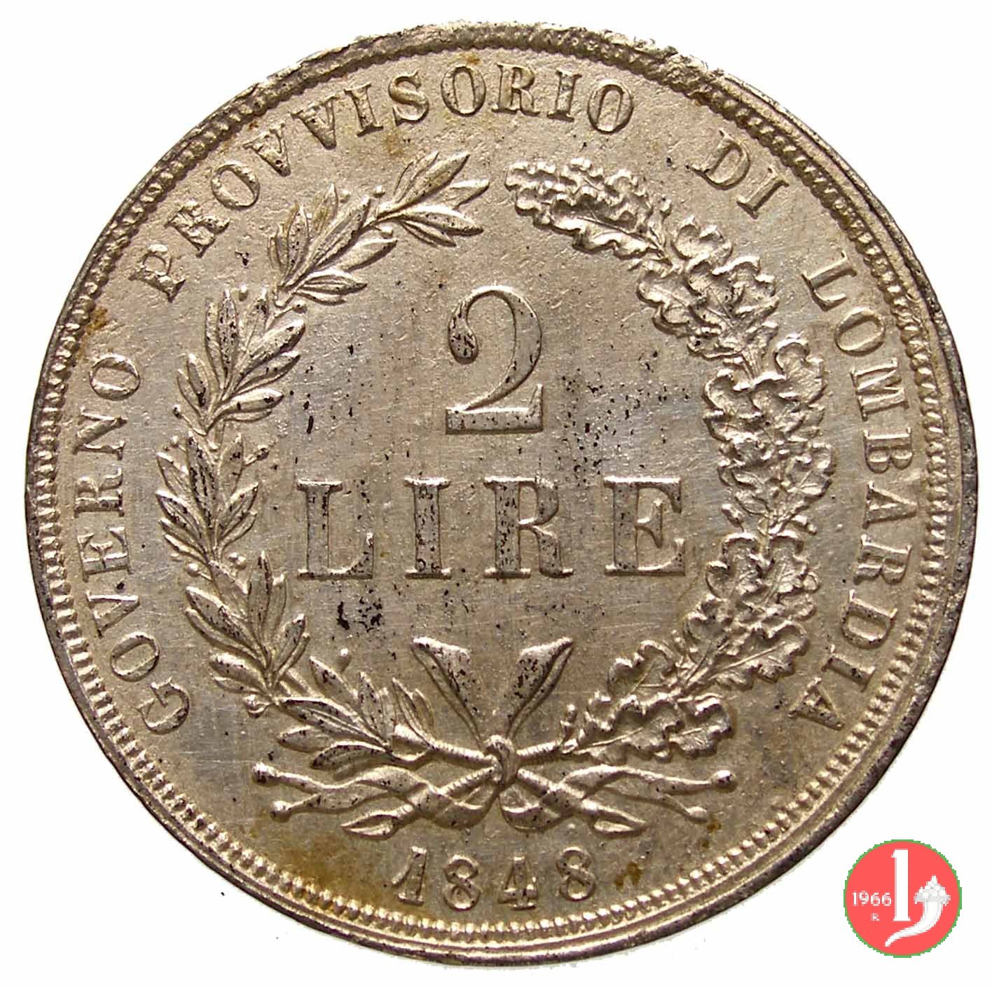 2 Lire Progetto Dritto: GOVERNO PROVVISORIO DI LOMBARDIA, nel campo 2 / LIRE / 1848 su tre righe tra due rami di lauro e di quercia; in basso 1848 Verso: ITALIA LIBERA DIO LO VUOLE Italia turrita stante a destra e posta su mensola; tiene nella destra un'asta, mentre con la sinistra indica l'alto; all'esergo M (segno di zecca per Milano) | |