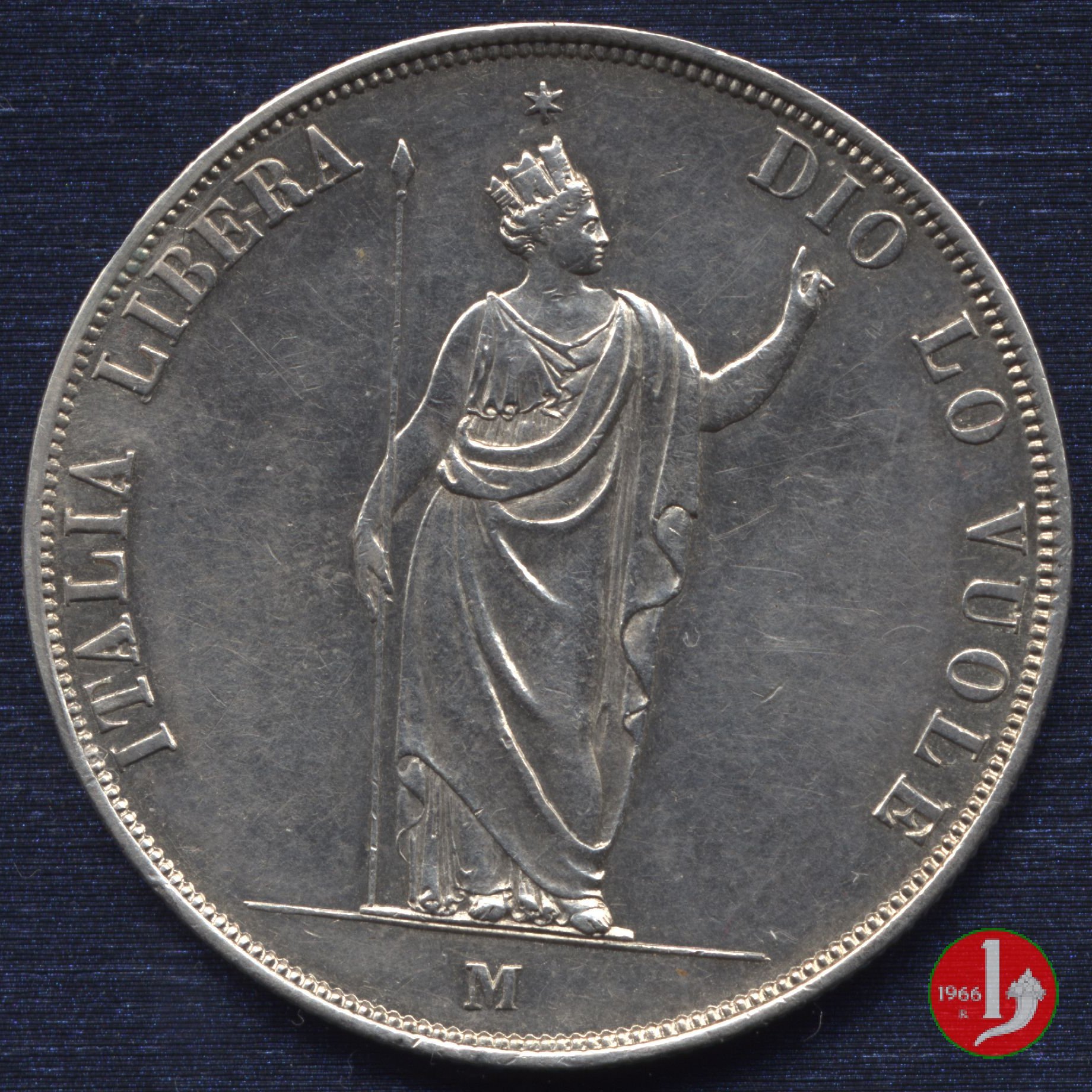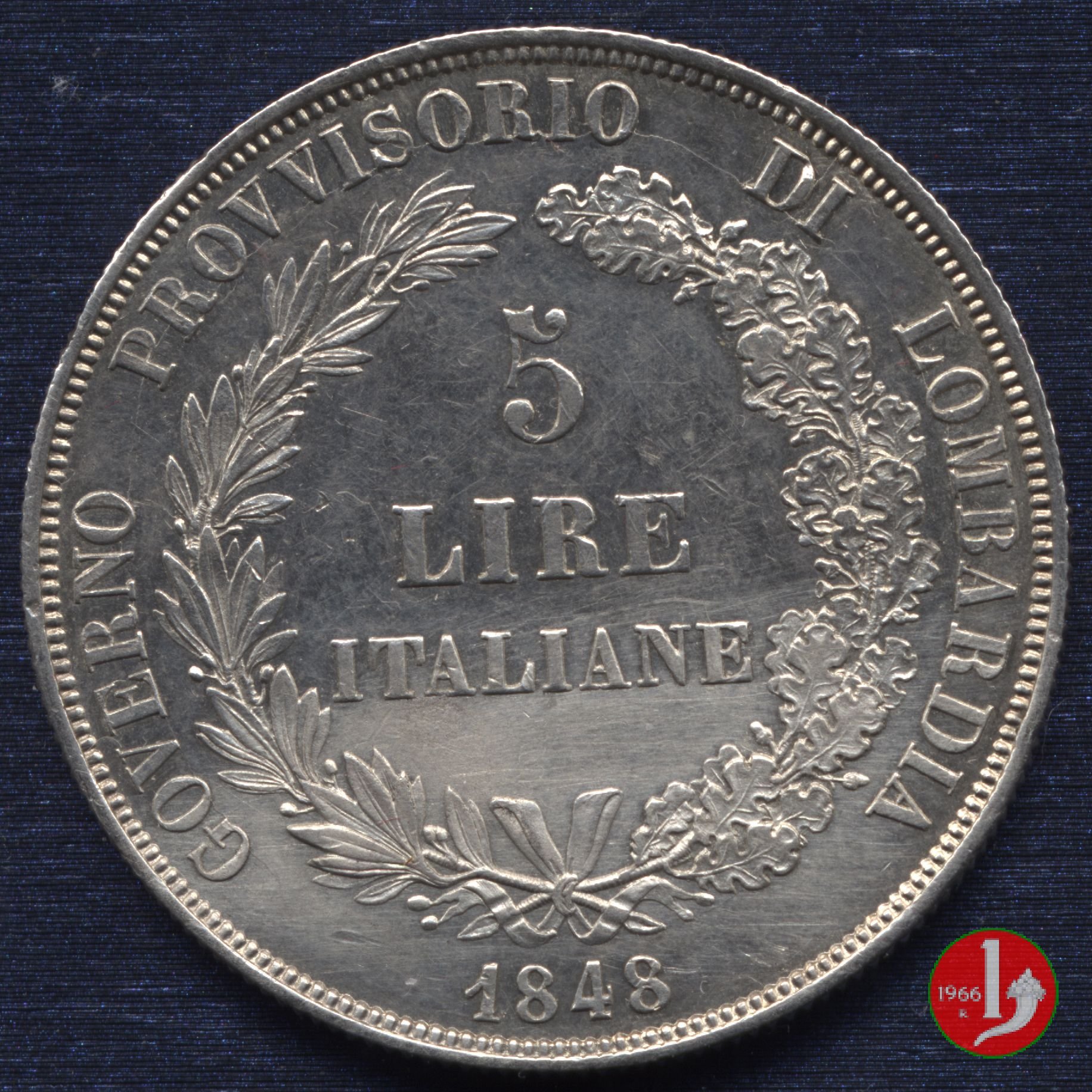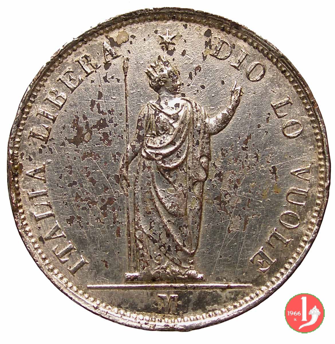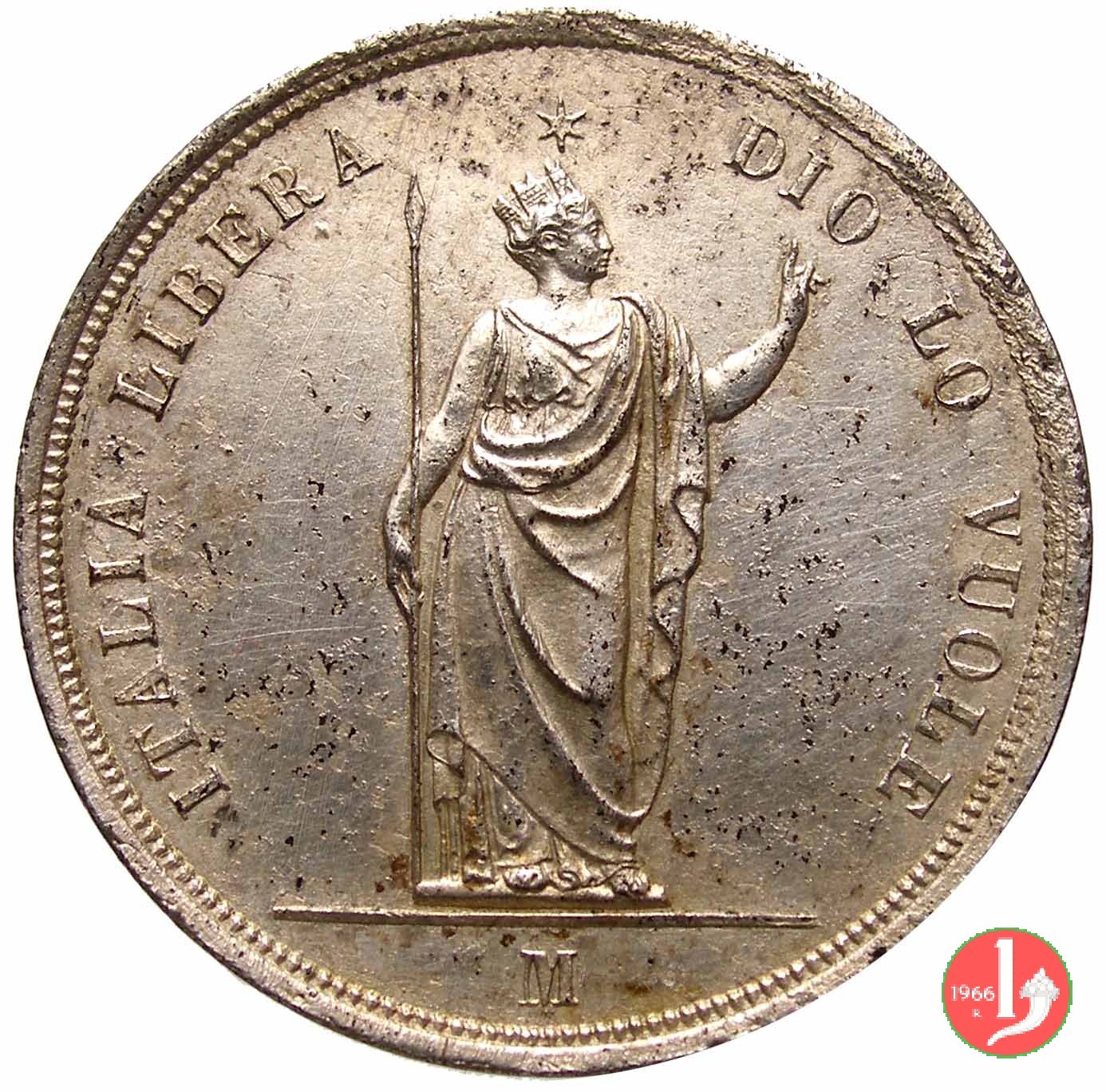 5 lire italiane Dritto: Indicazione del valore (5 LIRE ITALIANE) su tre righe circondata da rami di quercia (a destra) e di alloro (a sinistra). Intorno la scritta GOVERNO PROVVISORIO DELLA LOMBARDIA. Sotto la data (1848). Verso: Italia turrita in piedi che sorregge una lancia con la destra mentre con la sinistra indica la scritta circostante DIO LO VUOLE ITALIA LIBERA. In esergo il segno di zecca (M), in alto sopra la testa dell'Italia stella a sei punte. | |
