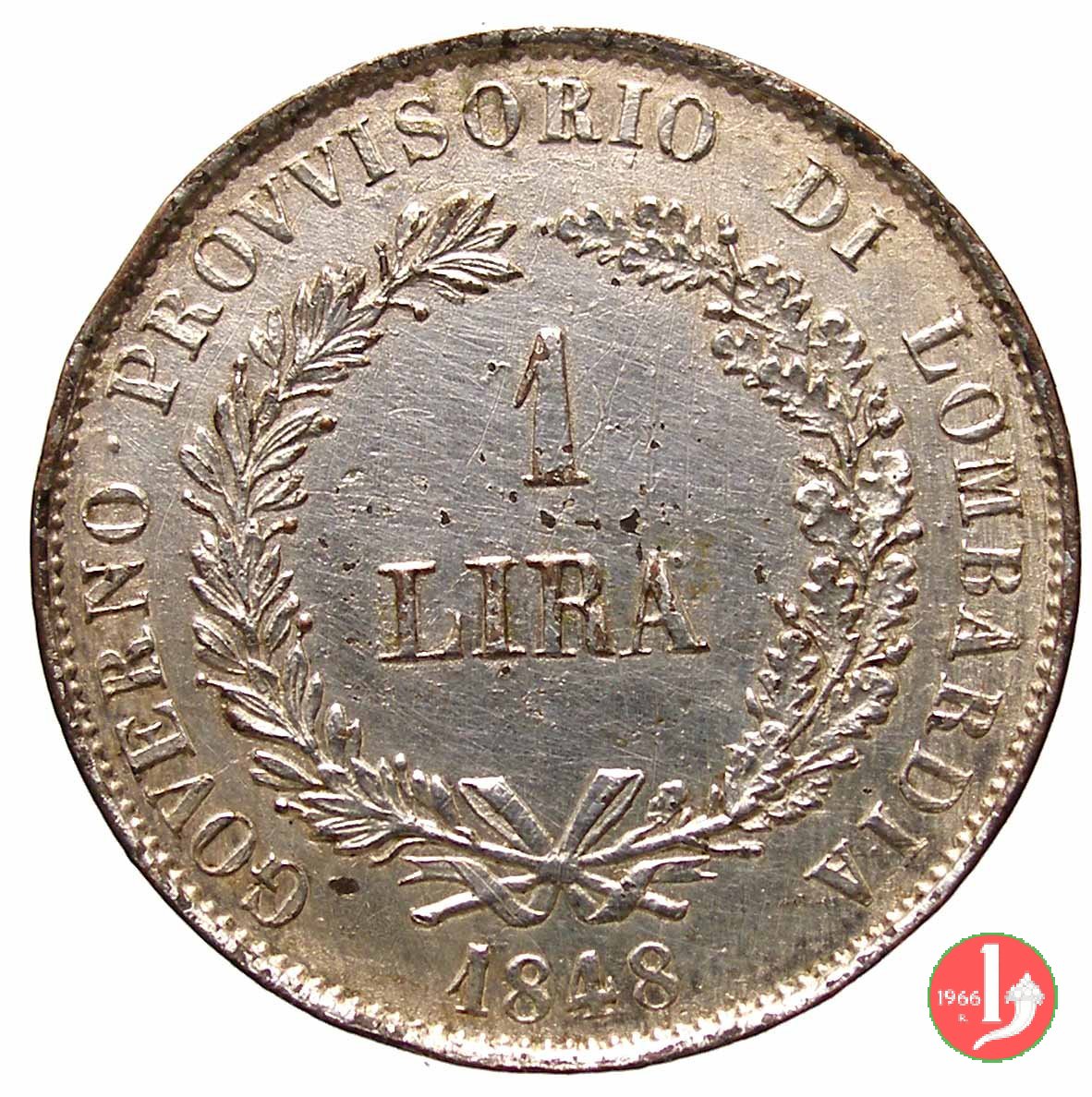1 Lira Progetto Dritto: GOVERNO PROVVISORIO DI LOMBARDIA, nel campo 1 / LIRA su due righe tra due rami di lauro e di quercia; in basso 1848 Verso: ITALIA LIBERA DIO LO VUOLE Italia turrita stante a destra e posta su mensola; tiene nella destra un'asta , mentre con la sinistra indica l'alto; all'esergo M (Segno di zecca per Milano) | |
