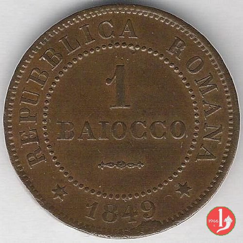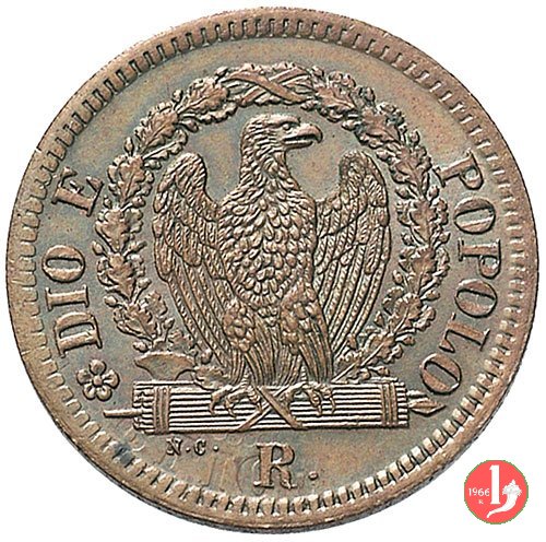 1 Baiocco Dritto: Il valore (1 BAIOCCO) sue due righe con fregio. Intorno la scritta REPUBBLICA ROMANA e la data tra stellette a sei punte. Verso: Aquila ad ali semi-spiegate che ghermisce un fascio. Intorno all'aquila corona di foglie di quercia e intorno la scritta DIO E POPOLO. Sotto il segno di zecca (R •) e le iniziali dell'autore N • C •. | |