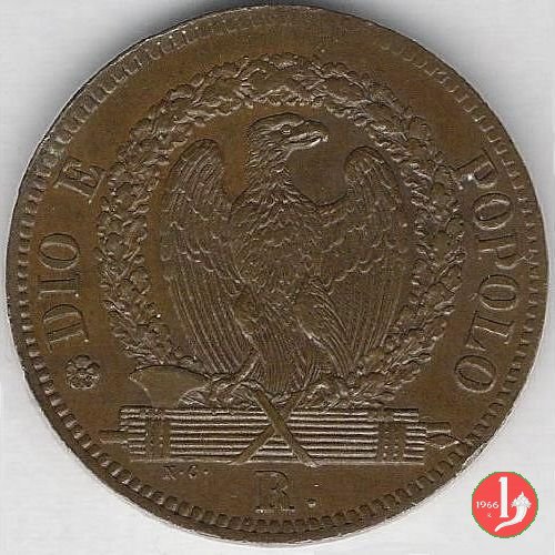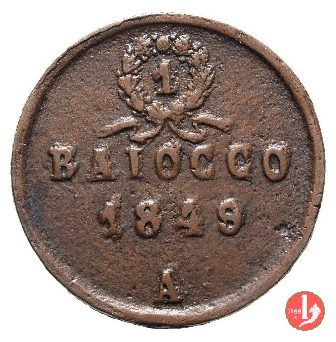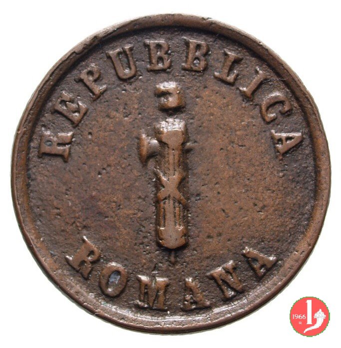 1 Baiocco Dritto: Fascio con scure sormontato da pireo. Intorno REPUBBLICA • ROMANA •. Verso: Il valore (1 BAIOCCO) e millesimo sue tre righe. L'1 del nominale si trova all'interno di una corona nastrata. In esergo, il segno di zecca (A). | |
