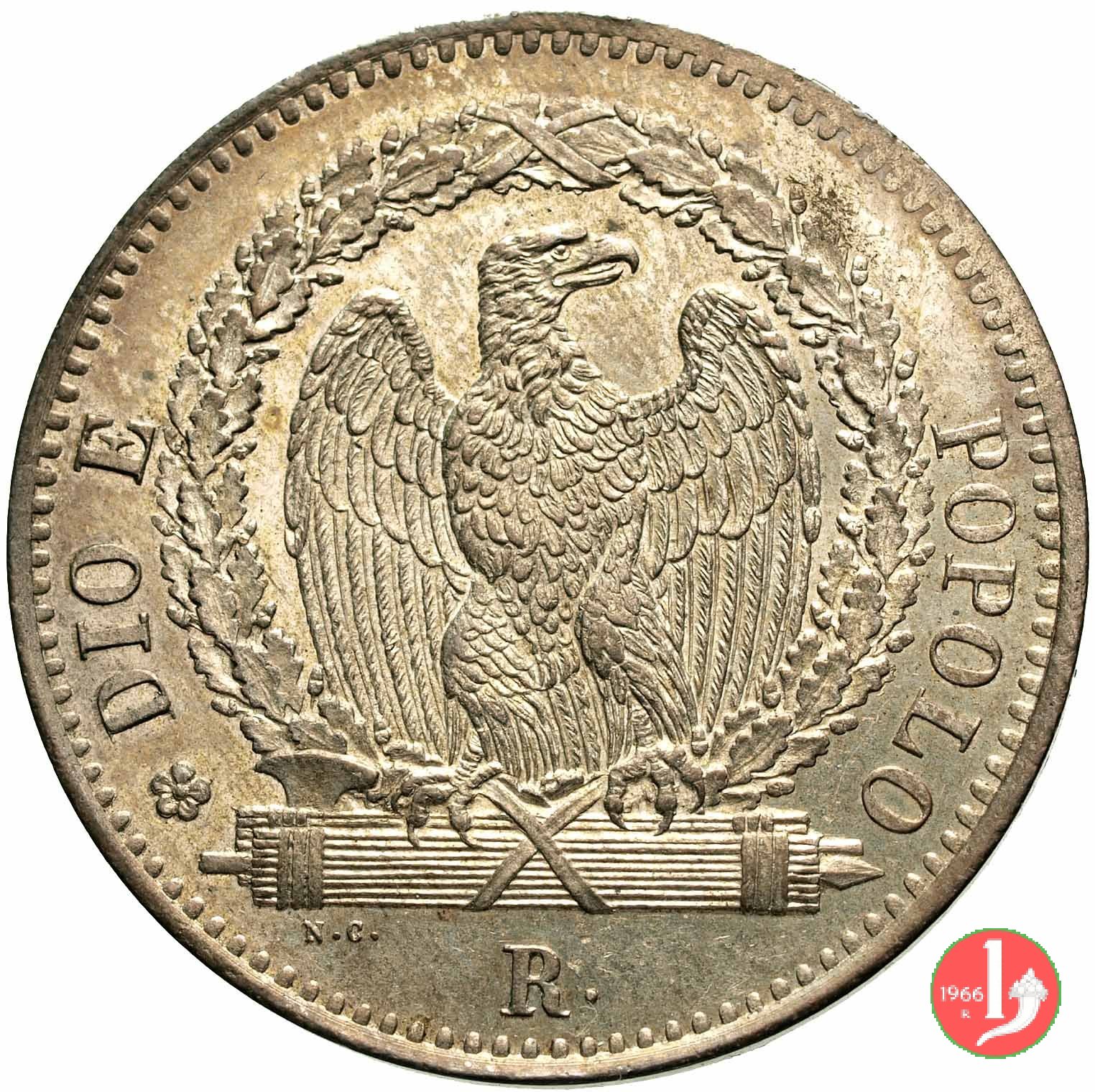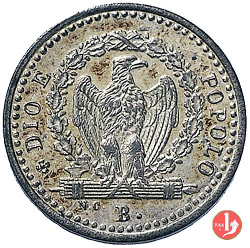 8 Baiocchi Dritto: Il valore (8 BAIOCCHI) sue due righe con fregio. Intorno la scritta REPUBBLICA ROMANA e la data tra stellette. Verso: Aquila ad ali semi-spiegate che ghermisce un fascio. Intorno all'aquila corona di foglie di quercia e intorno la scritta DIO E POPOLO preceduta da una rosetta. Sotto il segno di zecca (R •) e le iniziali dell'autore N • C •. | |