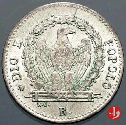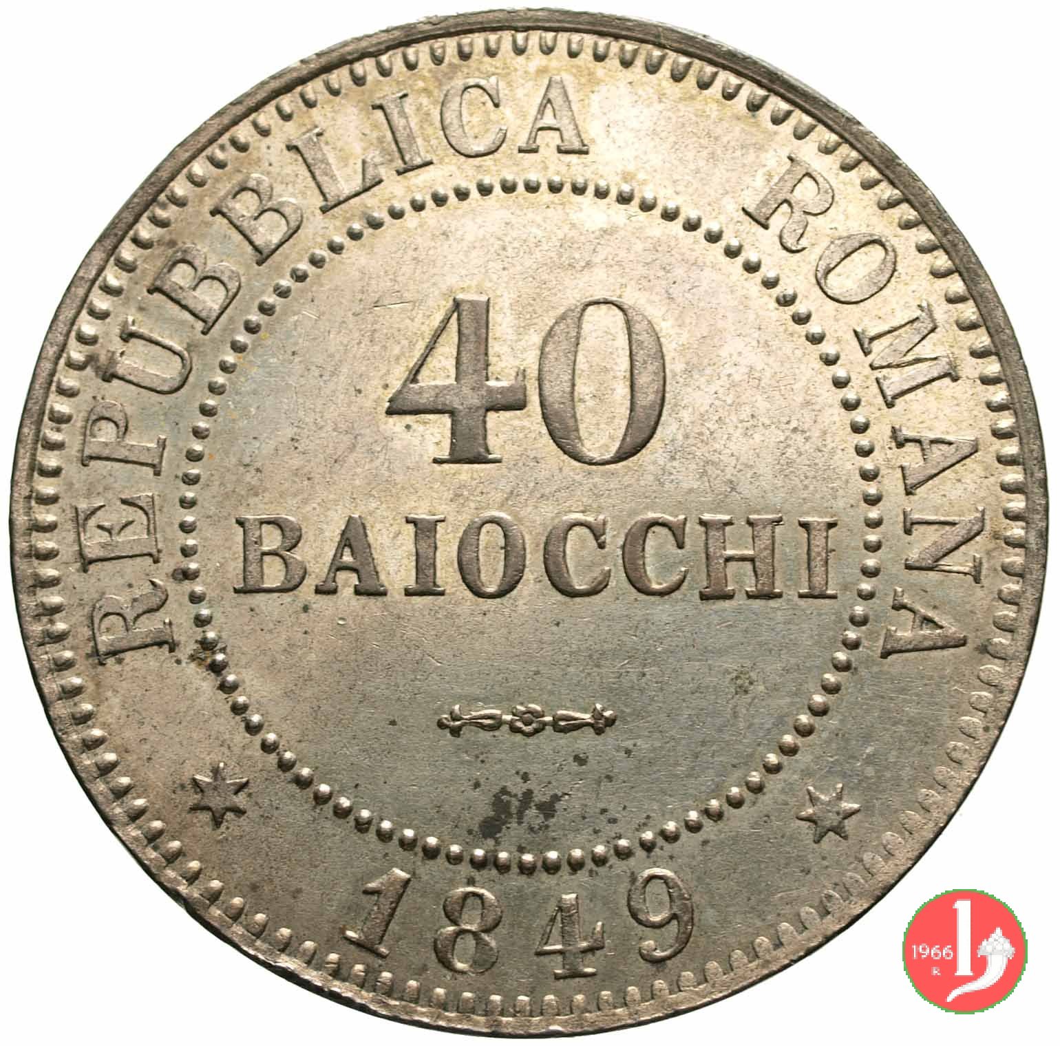 40 Baiocchi Dritto: REPUBBLICA ROMANA, in cerchio perlinato 40 / BAIOCCHI / fregio. In basso, nel giro esterno, 1849 tra due stellette. Verso: (rosetta) DIO E POPOLO, Aquila ad ali semi-spiegate che ghermisce un fascio, tutto compreso in corona di foglie di quercia legate in alto; all'esergo R. (Roma)ed a sinistra N. C. (Nicola Cerbara, incisore). | |