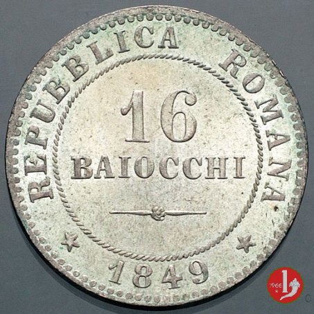 16 Baiocchi Dritto: Il valore (16 BAIOCCHI) sue due righe con fregio. Intorno la scritta REPUBBLICA ROMANA e la data tra stellette. Verso: Aquila ad ali semi-spiegate che ghermisce un fascio. Intorno all'aquila corona di foglie di quercia e intorno la scritta DIO E POPOLO preceduta da una rosetta. Sotto il segno di zecca (R) e le iniziali dell'autore N • C •. | |