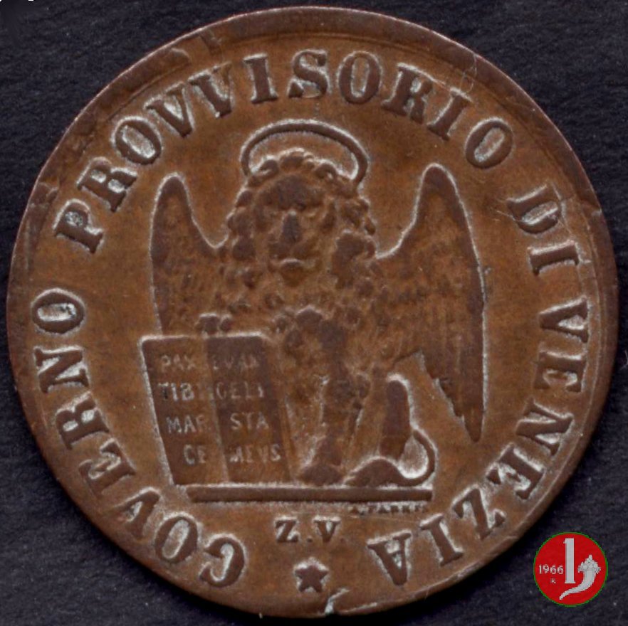 1 centesimo di lira corrente Dritto: Leone di S. Marco circondato dalla scritta GOVERNO PROVVISORIO DI VENEZIA Sotto in centro l'indicazione della zecca (Z • V •) ed una stella a 5 punte. Appena sotto l'appoggio del leone a destra il nome dell'incisore: A. FABRIS •. Verso: Su tre righe dall'alto, indicazione del valore (1), fregio e millesimo (1849). Intorno * CENTESIMO * DI LIRA CORRENTE. | |
