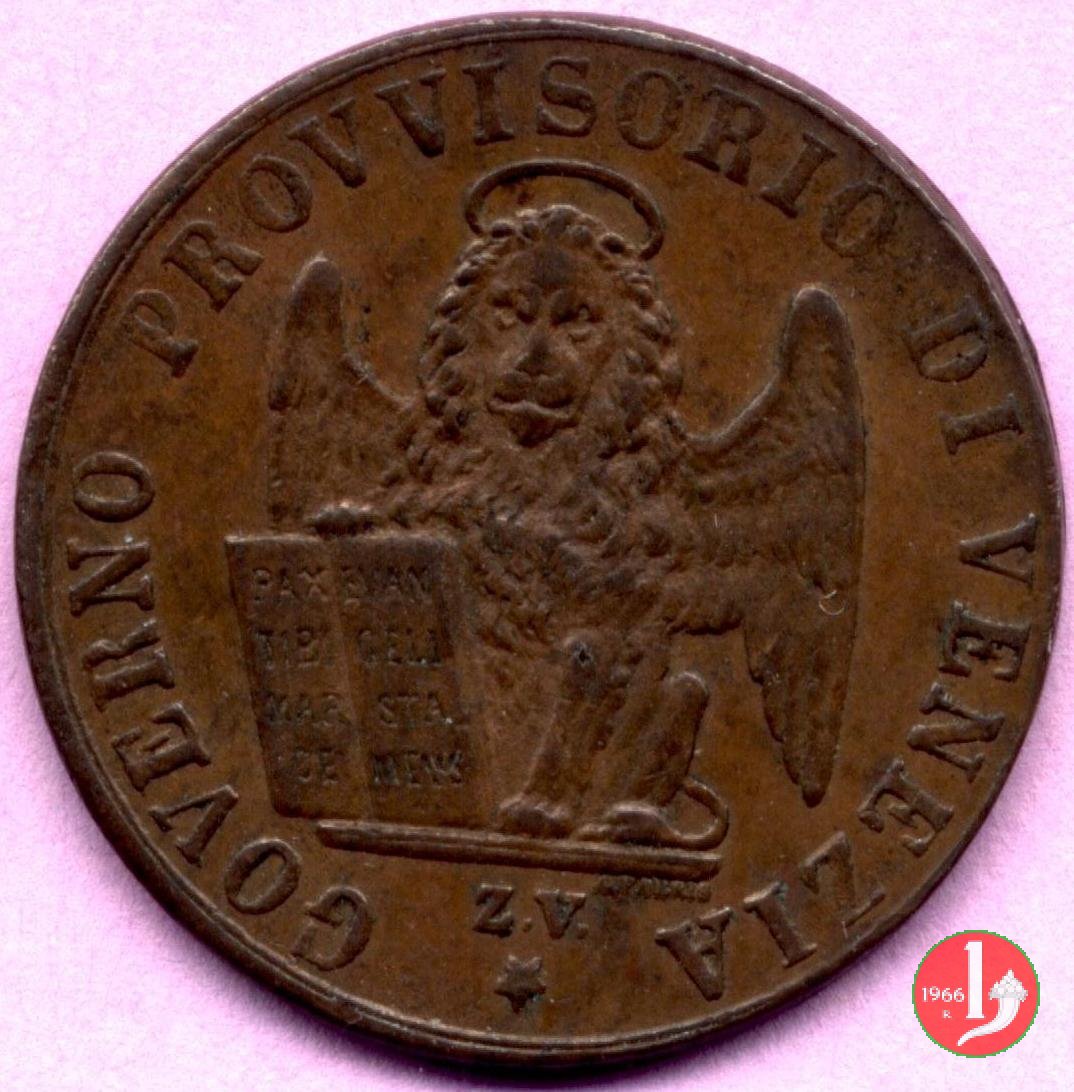 3 centesimi di lira corrente Dritto: Leone di S. Marco circondato dalla scritta GOVERNO PROVVISORIO DI VENEZIA • Sotto in centro l'indicazione della zecca (Z.V.) ed una stella a 5 punte. Appena sotto l'appoggio del leone a destra il nome dell'incisore: A. FABRIS • Verso: Indicazione del valore (3) con sotto la data (1849) separati da fregio. Intorno la scritta CENTESIMI DI LIRA CORRENTE e due stellette | |