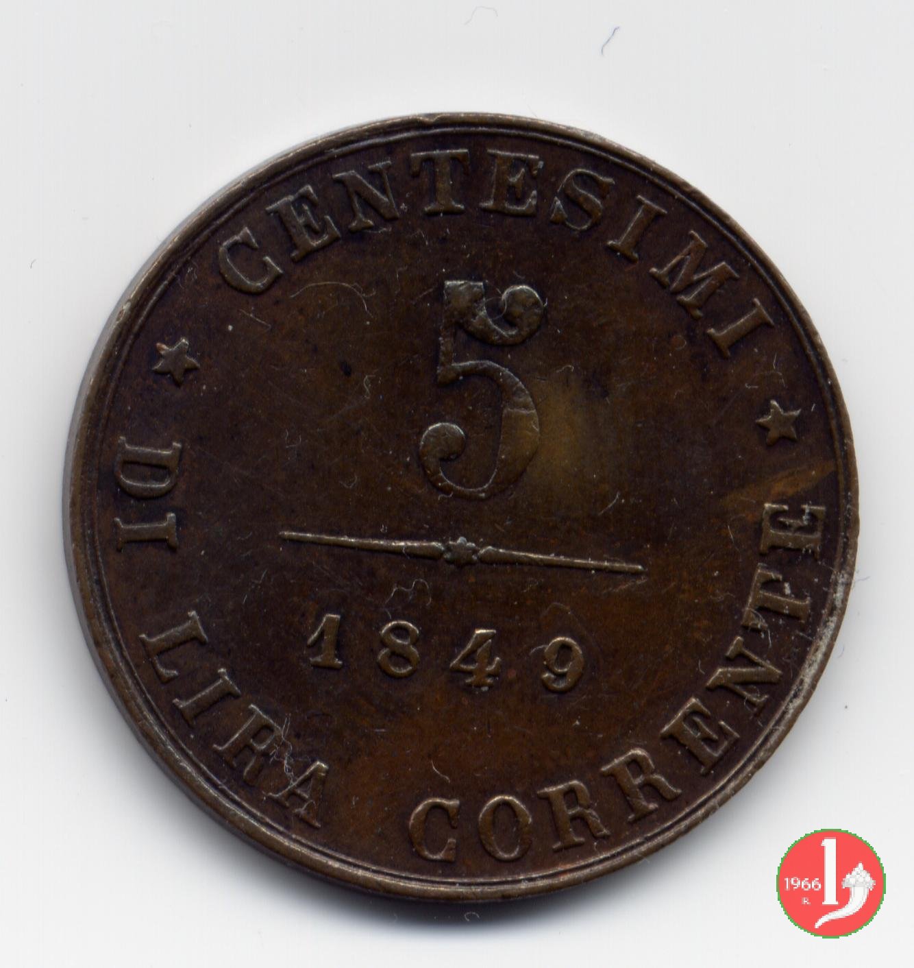 5 centesimi di lira corrente Dritto: Leone di S. Marco circondato dalla scritta GOVERNO PROVVISORIO DI VENEZIA Sotto in centro l'indicazione della zecca (Z • V •) ed una stella a 5 punte. Appena sotto l'appoggio del leone a destra il nome dell'incisore: A. FABRIS •. Verso: Su tre righe dall'alto, indicazione del valore (5), fregio e millesimo (1849). Intorno * CENTESIMI * DI LIRA CORRENTE. | |