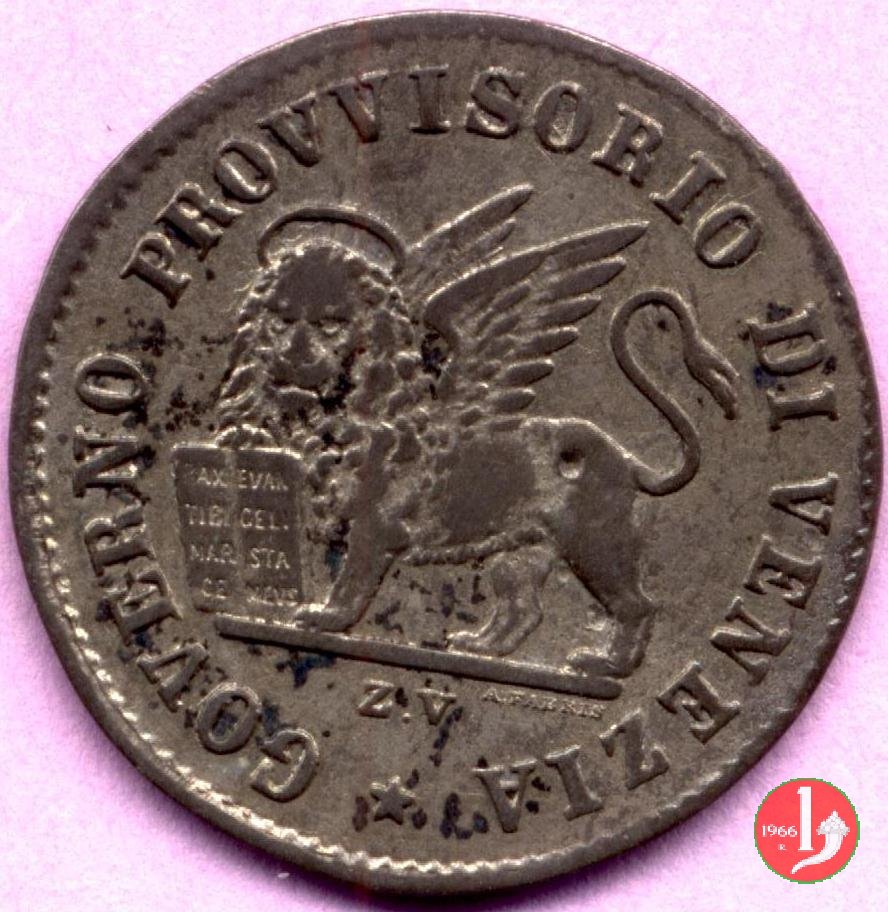 15 centesimi di lira corrente Dritto: Leone di S. Marco circondato dalla scritta GOVERNO PROVVISORIO DI VENEZIA • Sotto a destra il nome dell'incisore A. Fabris e in centro l'indicazione della zecca Z • V •. Verso: Indicazione del valore (15) entro un cerchio di perline. Intorno la scritta CENTESIMI DI LIRA CORRENTE e la data (1848) separate da due stellette. | |