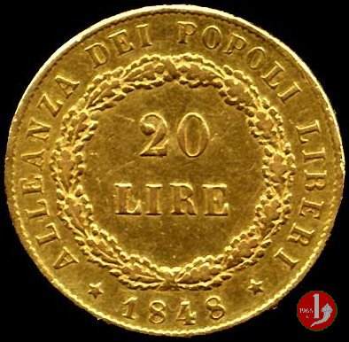 20 lire italiane Dritto: Italia turrita in piedi che sorregge una lancia con la destra mentre con la sinistra indica la scritta circostante DIO LO VUOLE ITALIA LIBERA. In esergo il segno di zecca (M), in alto sopra la testa dell'Italia stella a sei punte. Verso: Indicazione del valore (20 LIRE ITALIANE) su tre righe circondata da rami di quercia (a destra) e di alloro (a sinistra). Intorno la scritta GOVERNO PROVVISORIO DELLA LOMBARDIA. Sotto la data (1848). | |
