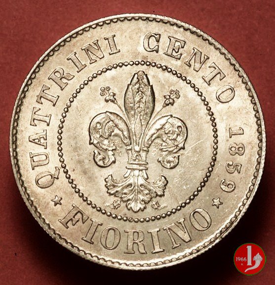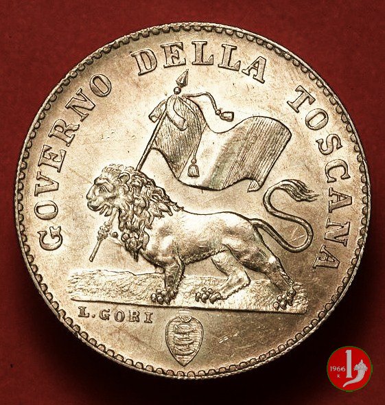 1 fiorino Dritto: Entro un cerchio di perline, il giglio araldico di Firenze. Intorno, una stella a cinque punte, QUATTRINI CENTO, il millesimo (1859), una stella a cinque punte e indicazione del valore (FIORINO). Verso: Il Marzocco, il leone simbolo di libertà, che procede verso sinistra con tricolore, intorno GOVERNO PROVVISORIO DELLA TOSCANA. In esergo stemma del Guicciardini (tre corni da caccia o "Guicciarde") che fu prima di Ridolfi il direttore della zecca di Firenze e indicazione dell'autore (L. GORI). | |