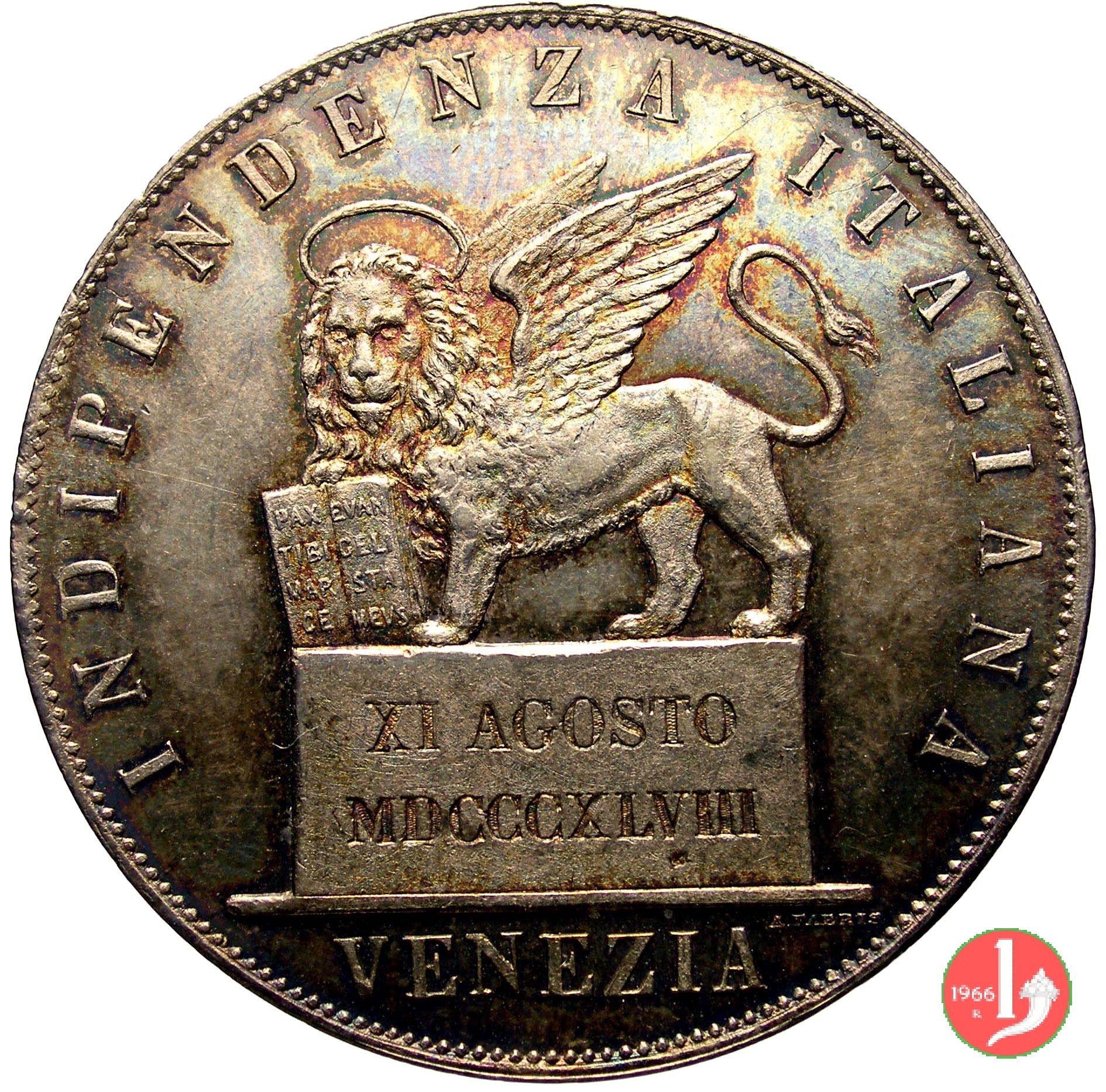 5 lire 11 agosto 1848 Dritto: Indicazione del valore (5 LIRE) su due righe circondato una corona di rami di quercia. Intorno ALLEANZA DEI POPOLI LIBERI, sotto separato da questa scritta da due stelle a 5 punte l'indicazione del millesimo (1848). Verso: Leone di S. Marco posto su di un piedistallo che reca la scritta in incuso XI AGOSTO MDCCCXLVIII su due righe. Intorno INDIPENDENZA ITALIANA. In esergo VENEZIA e sotto il basamento del leone a destra indicazione dell'incisore A. FABRIS. | |