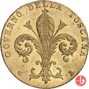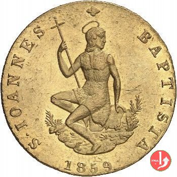 1 ruspone Dritto: San Giovanni Battista (patrono di Firenze) seduto con croce, intorno S • IOANNES BAPTISTA e, in basso, il millesimo (1859). Verso: Nel campo giglio araldico fiorentino, intorno GOVERNO DELLA TOSCANA. In basso, a sinistra, indicazione dell'autore (G •), a destra, cinque monti con banda (segno del direttore di zecca marchese Luigi Ridolfi). |