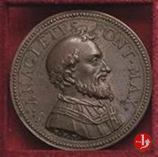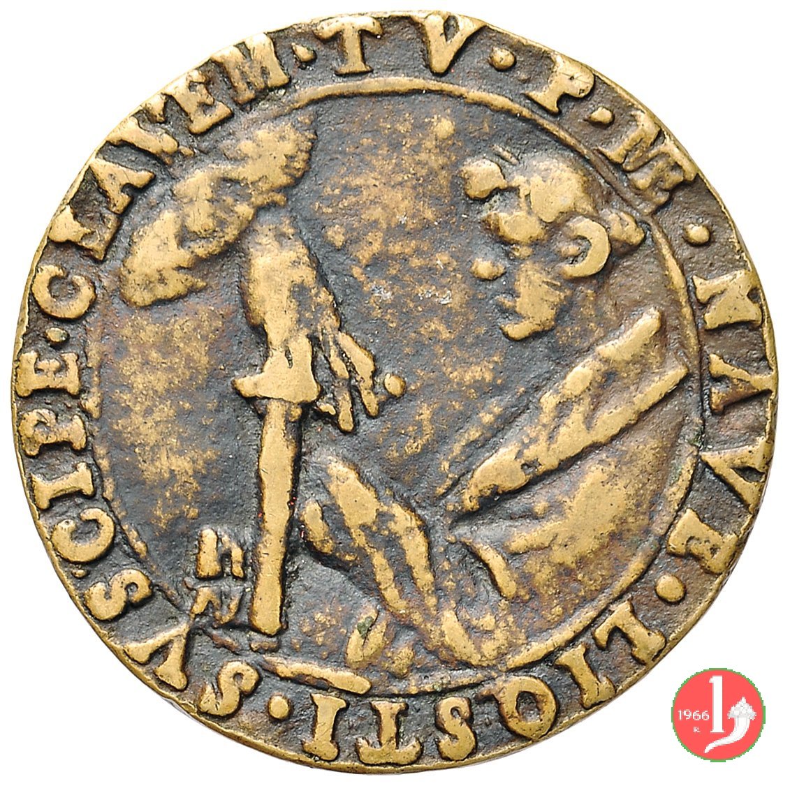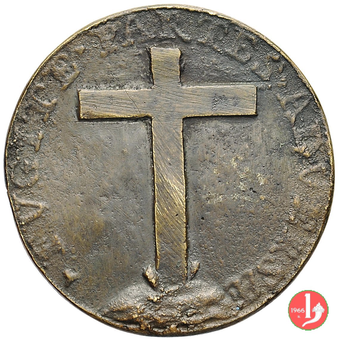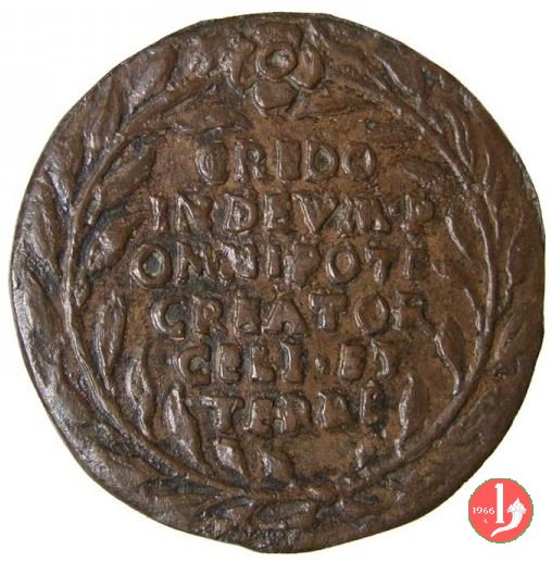 Verso: nel campo entro rami d'alloro, fermati in alto da fiore e legati in basso da nastro: CREDO = IN DEVM • P = OMNIPOTE = CREATOR = CAEL • ET = TERRE