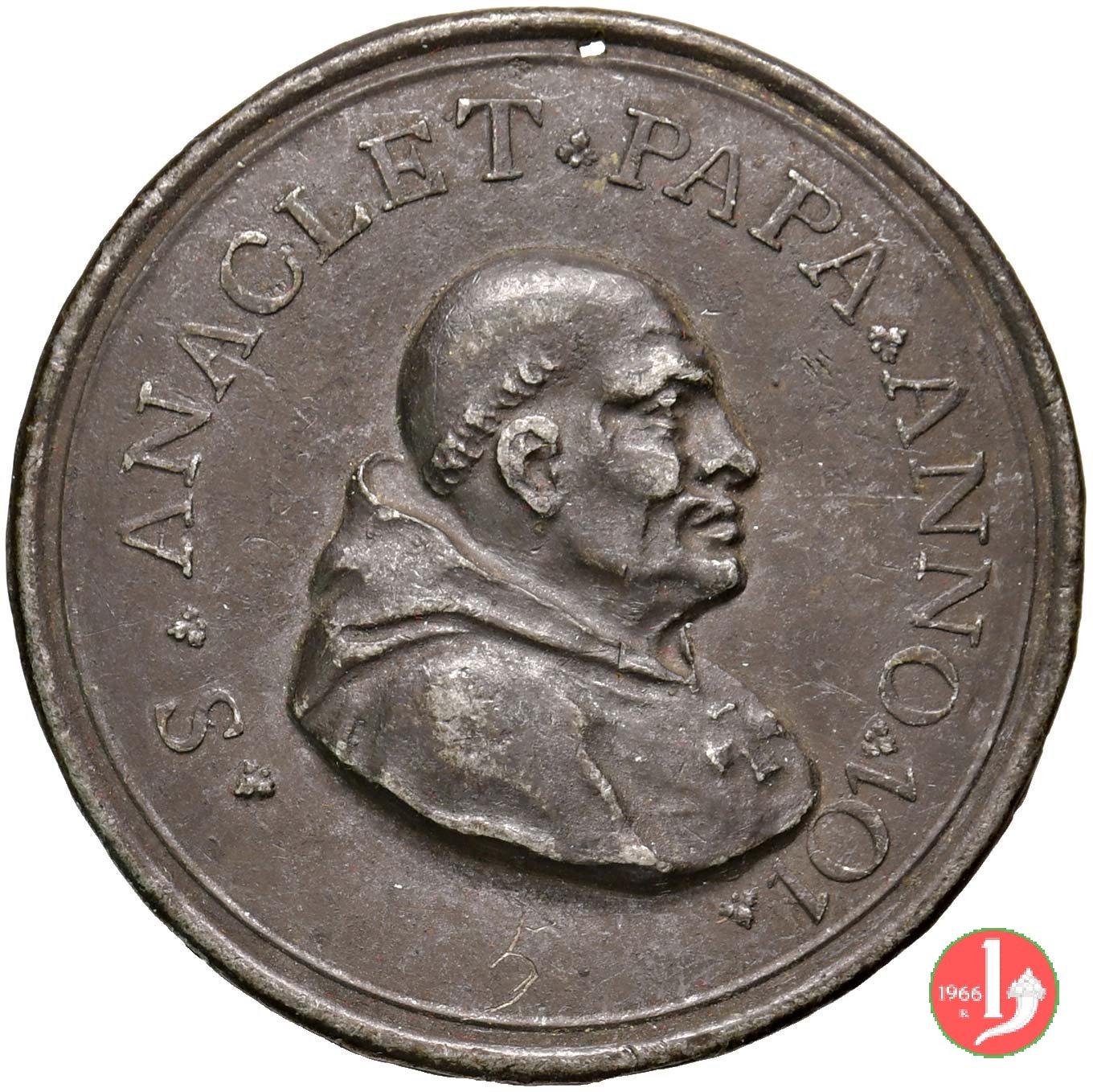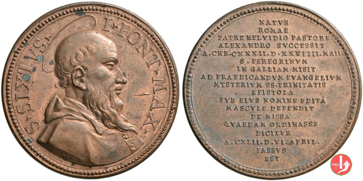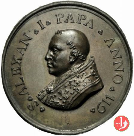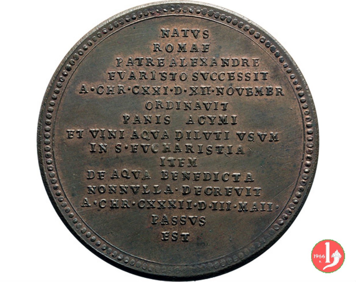 Verso: NATVS = ROMAE = PATRE ALEXANDER = EVARISTO SVCCESSIT = A.CHR.CXXI.D.XII.NOVEMBR = ORDINAVIT = PANIS ACYMI = ET VINI AQVA BENEDICTA = NONNVLLA DECREVIT = A.CHR.CXXXII.D.III.MAII. = PASSVS = EST