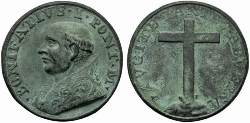3- Di restituzione - San Pietro e Chiavi Dritto: BONIFATIVS • I • PONT _ M • busto a sx con piviale e razionale Chiavi decussate e busto di San Pietro, nimbato, di fronte | |