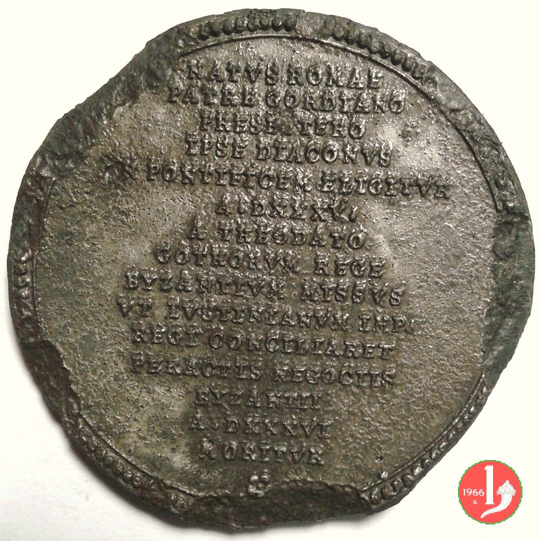 Verso: nel campo: • = NATIONE = CETANVS = HORDINAT PONTIF • = A THEODATO = GOTHORVM REGE = PONTIFEX CREATVR = A • DXXXVI • = REGE AVTEM DEFENCTO = A BELISARIO = ARTIBVS VIGILII = IN EXCILIVM PVLSVS = A • DXL • XX • IVNII • = ESVL = OBIIT