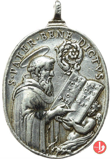 mezzo busto di San Benedetto nimbato legge su tomo retto da Angelo: AV = SCVL = TA = O = FILI _ PRAE = GEV = TA = MAG
