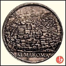 la figura allegorica della Città di Roma, elmata e seduta verso dx, presso la Lupa Capitolina, indica a dx