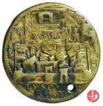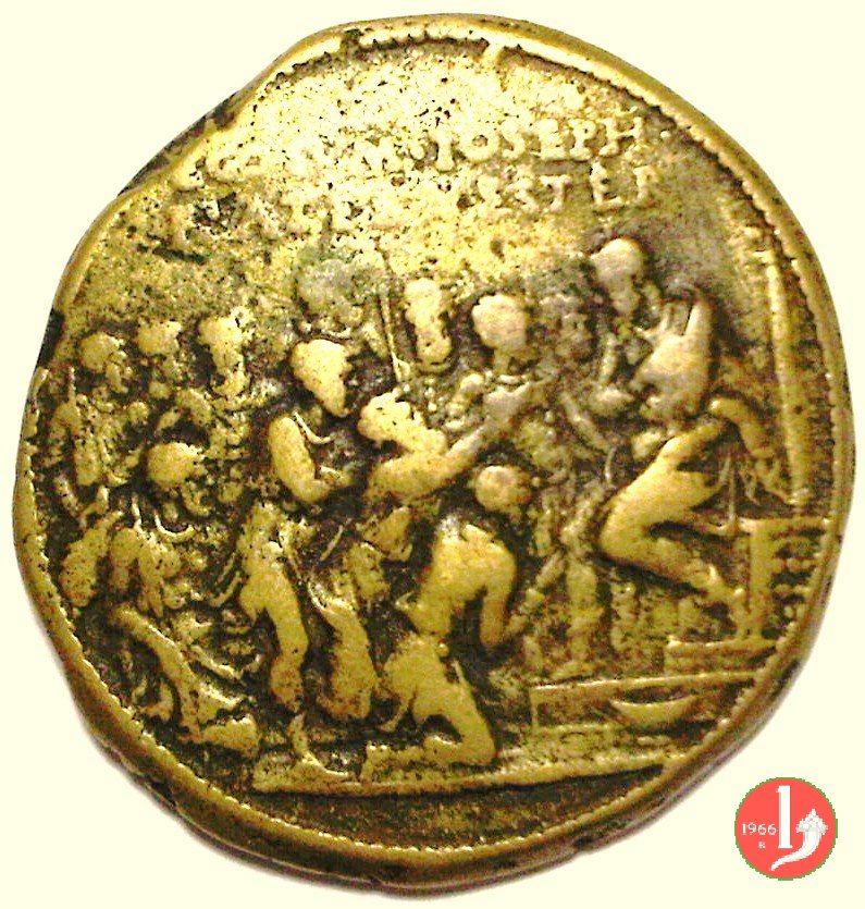 Verso: entro corona di alloro: Scena allegorica con soldati, due prigionieri e figura seduta verso sx con scettro