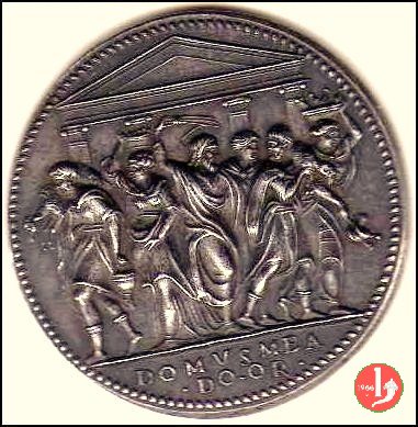 Verso: Cristo scaccia mercanti davanti a tempio quattrastilo ionico in prospetto (Tempio di Gerusalemme)