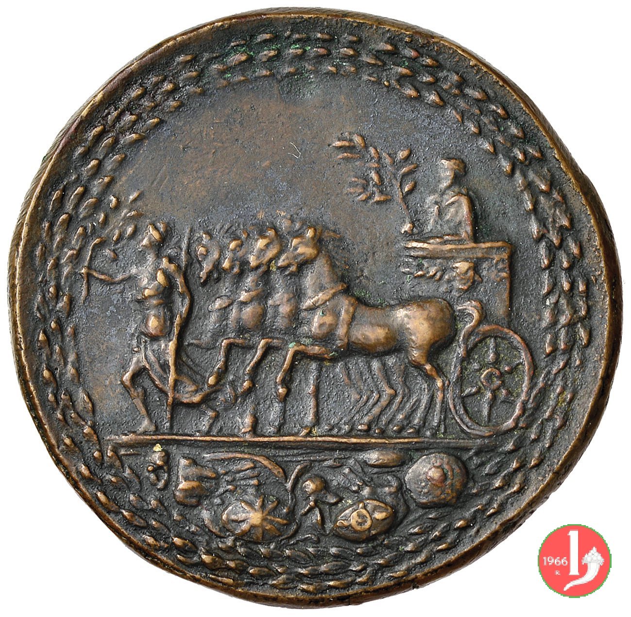 Verso: Guerriero regge ramo d'ulivo e precede quadriga, verso sx, condotta dalla figura allegorica della Pace