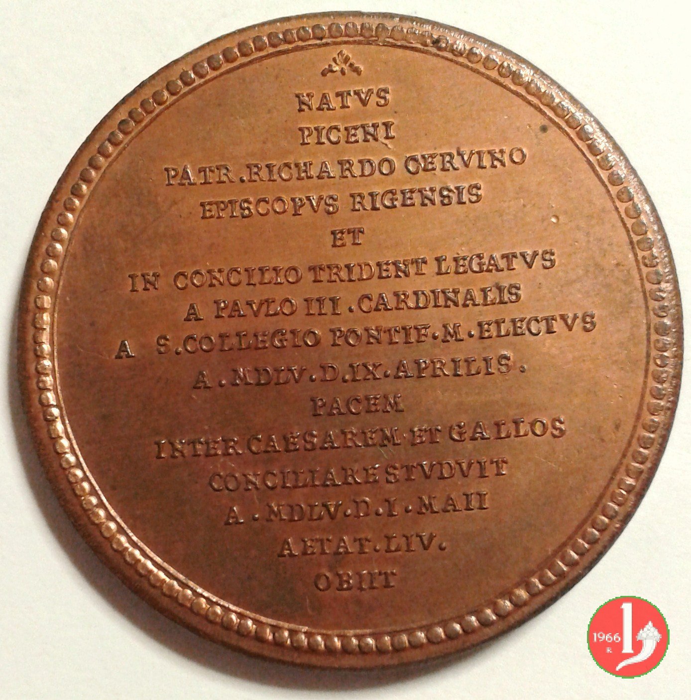 Verso: fregio = NATVS = PICENI = PATR. RICHARDO CERVINO = EPISCOPVS RIGENSIS = ET = IN CONCILIO TRIDENT LEGATVS = A PAVLO III.CARDINALIS = A S.COLLEGIO PONTIF.M.ELECTVS = A.MDLV.D.IX.APRILIS. = PACEM = INTER CAESAREM.ET GALLOS = CONCILIARE STVDVIT = A.MDLV.D.I.MAI = AETAT.LIV. = OBIIT