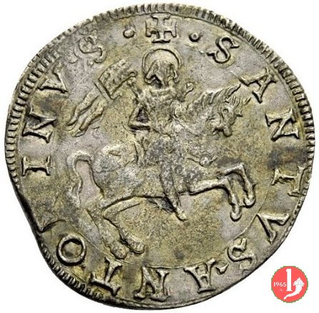 testone Dritto: Aquila coronata, linguata, spiegata e con coda gigliata, intorno • SVNIBALDVS • FLI • PRIN • VAL • TARI •. Verso: Santo nimbato a cavallo con stendardo verso destra, intorno ✠ • SANTVS • ANTONINVS •. |