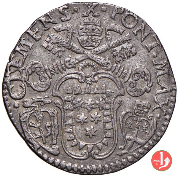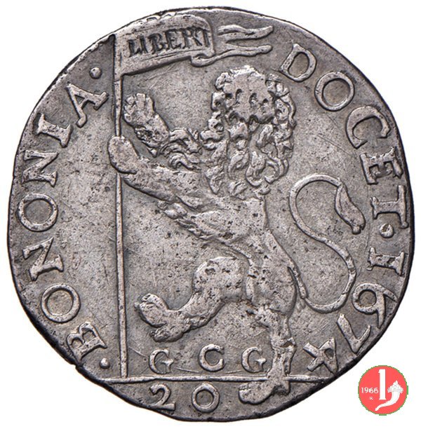 lira Dritto: • CLEMENS • X • PONT • MAX • Stemma sormontato da chiavi decussate e tiara; in basso, a sinistra, l’armetta del cardinale legato e, a destra, della città, con cimasa sormontata da testa leonina Verso: • BONONIA • DOCET • (millesimo) • Leone rampante a sinistra con vessillo; in esergo, • 20 • | |