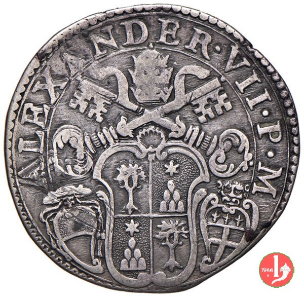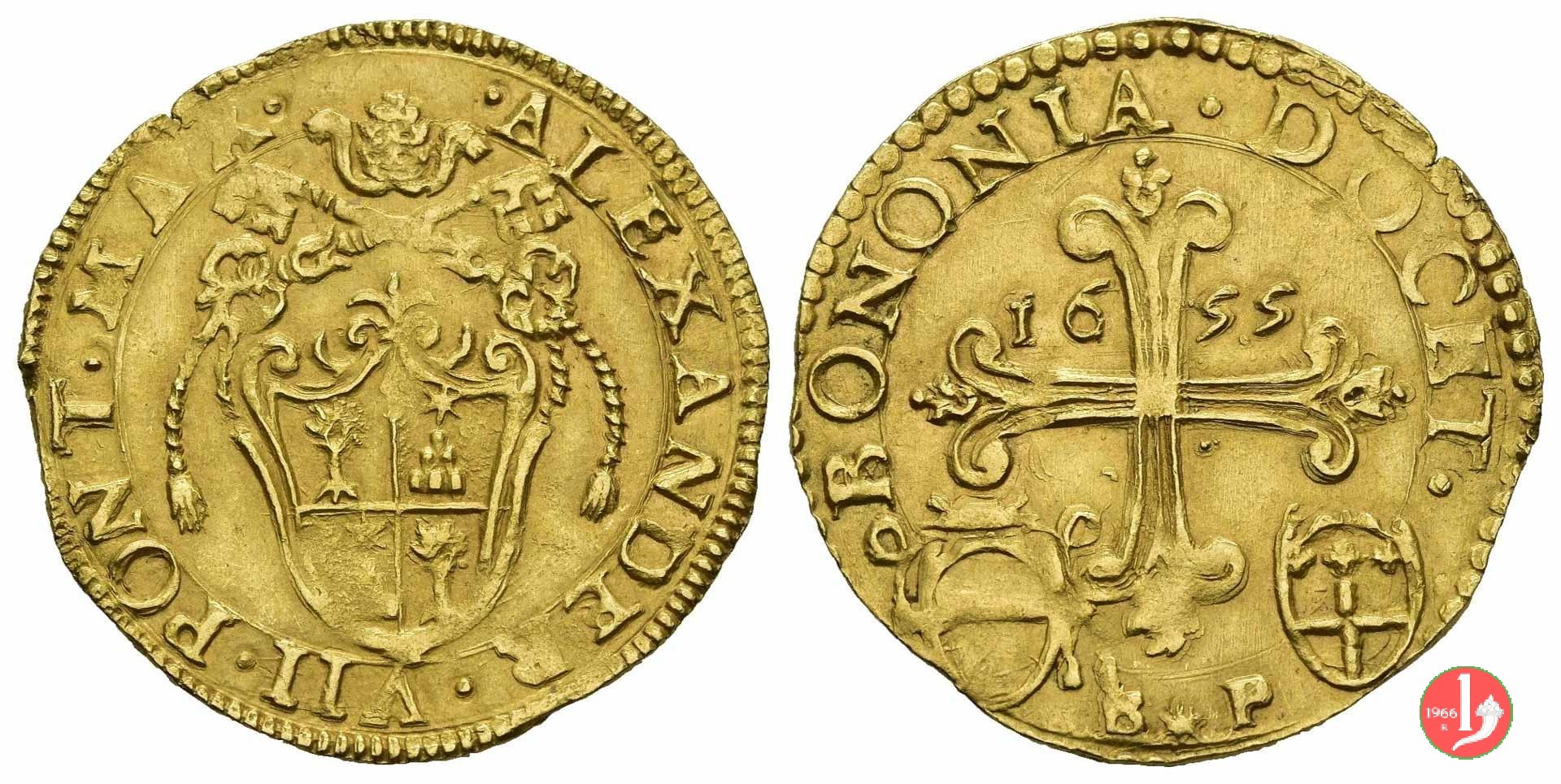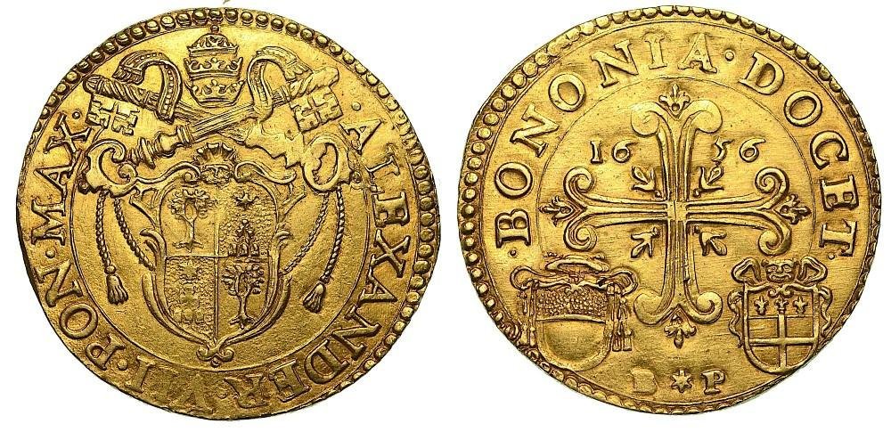scudo d'oro Dritto: •ALEXANDER •VII •PONT •MAX • nel campo stemma papale semiovale gigliato, con chiavi decussate e tiara Verso: •BONONIA •DOCET nel campo Croce a dividere il millesimo,armetta del Legato Giovanni Girolamo Lomellini a sinistra e a destra della citta' con croce senza cimasa. | |