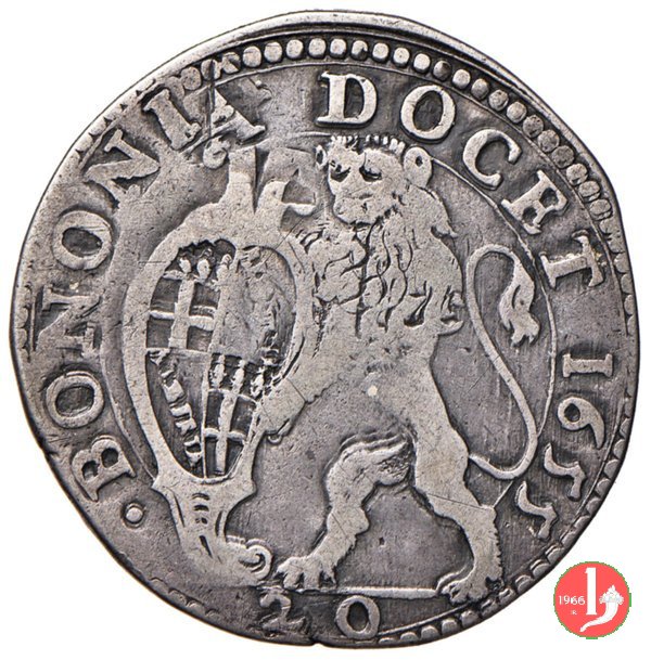 lira Dritto: • INNOCENTIVS • XI • PONT • M • Stemma sormontato da chiavi decussate e tiara; in basso, a sinistra, l’armetta del cardinale legato e, a destra, della città, con cimasa sormontata da testa leonina Verso: • BONONIA • DOCET • (millesimo) • Leone rampante a sinistra con vessillo; in esergo, • 20 • | |