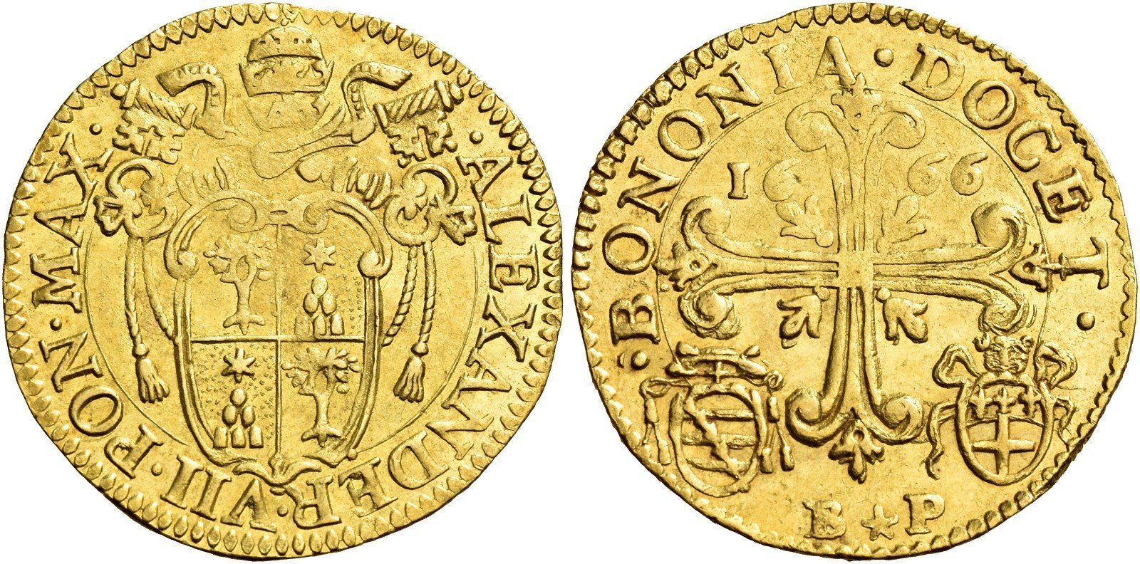 quadrupla o doblone Dritto: •ALEXANDER •VII •PON •MAX • Stemma inquartato, in cornice ovale con cimasa a volute, sormontato da chiavi decussate e tiara. Verso: BONONIA DOCET Croce filettata e gigliata, accantonata da quattro giglietti e intervallata in alto dalla data. Sotto, gli stemmi del Cardinale legato Lomellini e della città con croce a cimasa gigliata. All'esergo, iniziali dello Zecchiere. | |