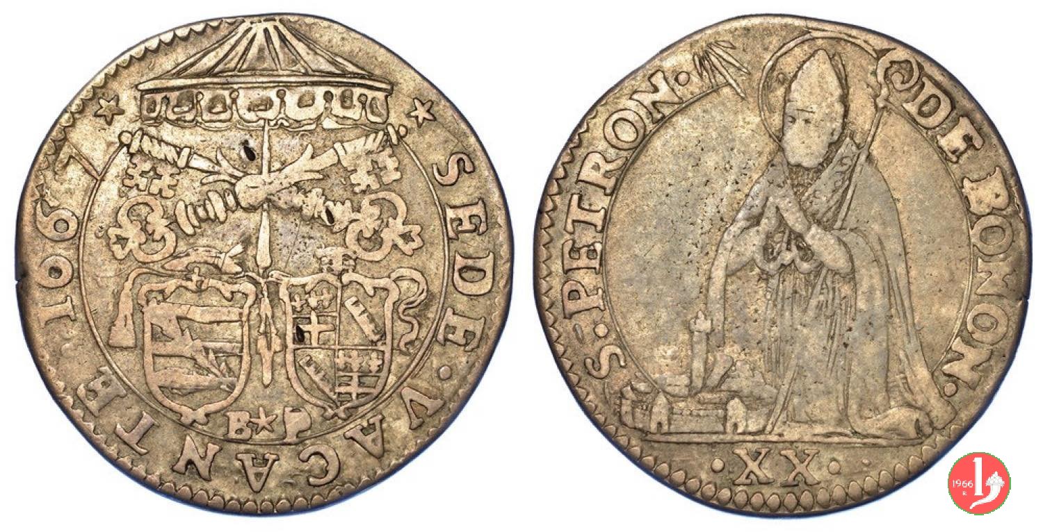 lira Dritto: *SEDE •VACANTE •1667 * Nel campo stemmi affiancati del del Card. Carafa della Spina e della Città sormontati da padiglione e chiavi decussate; in basso sigla B *P Verso: S •PETRON DE BONON nel campo S. Petronio genuflesso orante; all’esergo, •XX • | |