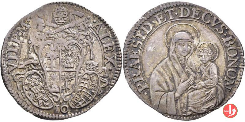 mezza lira Dritto: •ALEX • •VII •P •M • Stemma ovale sormontato da triregno e chiavi decussate, in basso a sinistra armetta del legato, a destra armetta della citta' inquartata Verso: •PRAESID •ET •DECUS •BONON Madonna di San Luca con bambino. | |