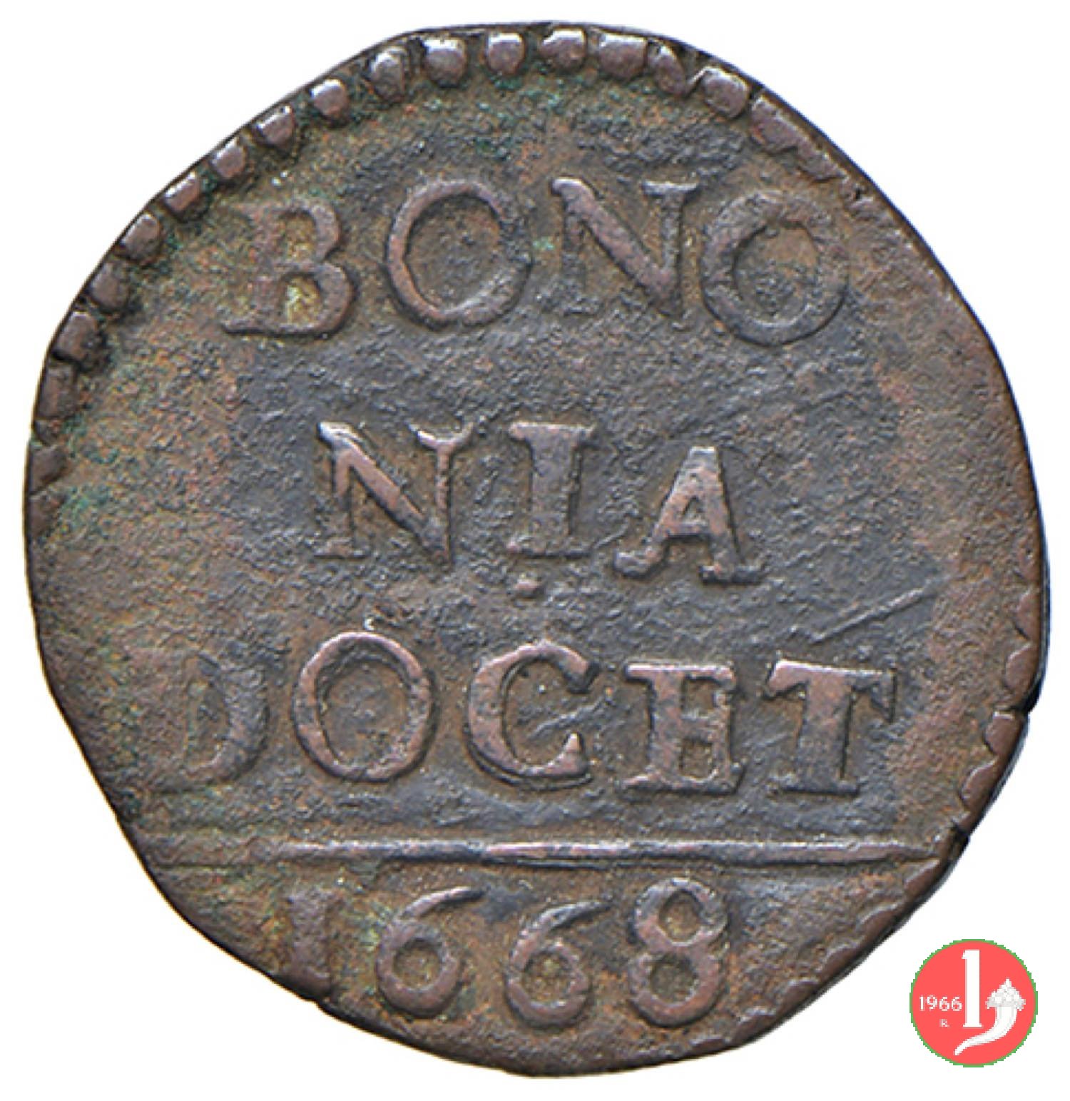 doppia Dritto: •ALEXANDER •VII •PON •MAX •Stemma sormontato da triregno e chiavi decussate. Verso: •BONONIA •DOCET •Croce fiorita accantonata, in alto, da 16 – XX e, in basso, da armette del cardinale legato e della Città. Sotto, nel giro, B*P | |