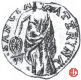 San Nazario stante di fronte, aureolato e corazzato, con un ramo di palma nella mano destra.