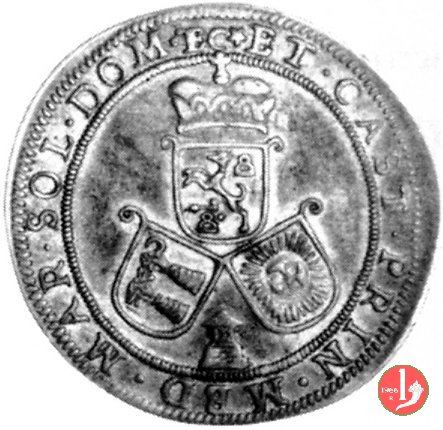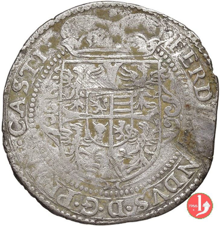2/3 di tallero con i tre stemmi Obverse: * FERDINANDVS • II • SAC • RO • IMPER • Busto corazzato a destra, con lunga parrucca. Tre scudi (nell'ordine: Medole, Castiglione e Solferino) disposti a triangolo e sormontati da corona principesca; sotto, una torre. | |