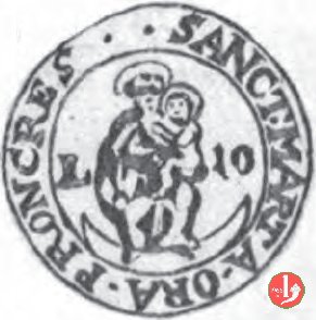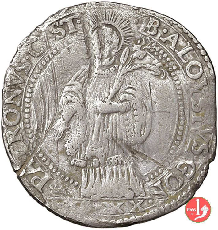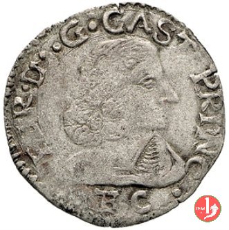 Mezza lira Obverse: • CAROLVS • D • G • CAST • PRINC • Stemma coronato composito in cornice di cartocci, cinque quarti alle aquile e uno allo spino, caricato al centro da antico scudetto Gonzaga inquartato ai leoni boemi e alle fasce. Semibusto nimbato e mitrato di San Nicola, benedicente e col pastorale nella mano sinistra; in es., data. | |