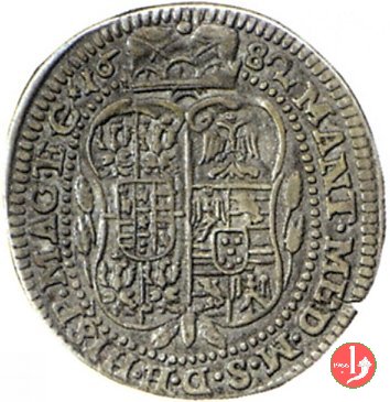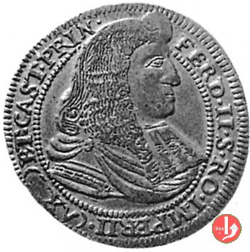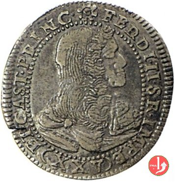 Da 25 soldi con stemma bipartito Obverse: * FERDI • II • S • R • IMPE ET • CAST • PRINC • Busto corazzato a destra, con lunga parrucca; nel giro in b. a sinistra: ( XXV ). Scudo bipartito alle armi Gonzaga e Pico, sormontato da corona principesca; in a., ai lati della corona, data. | |