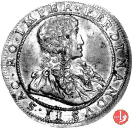 Da 25 soldi con l'aquila bicipite Obverse: FERD • II • S • RO • IMPERII • ET • CAST • PRIN • Busto corazzato a destra, con lunga parrucca; nel giro in b. a sinistra: ( XXV ). Aquila bicipite coronata ad ali spiegate, caricata in petto da stemma inquartato alle quattro aquile caricato in centro da vecchio scudetto Gonzaga ai leoni boemi e alle fasce. | |